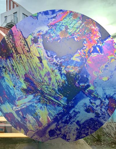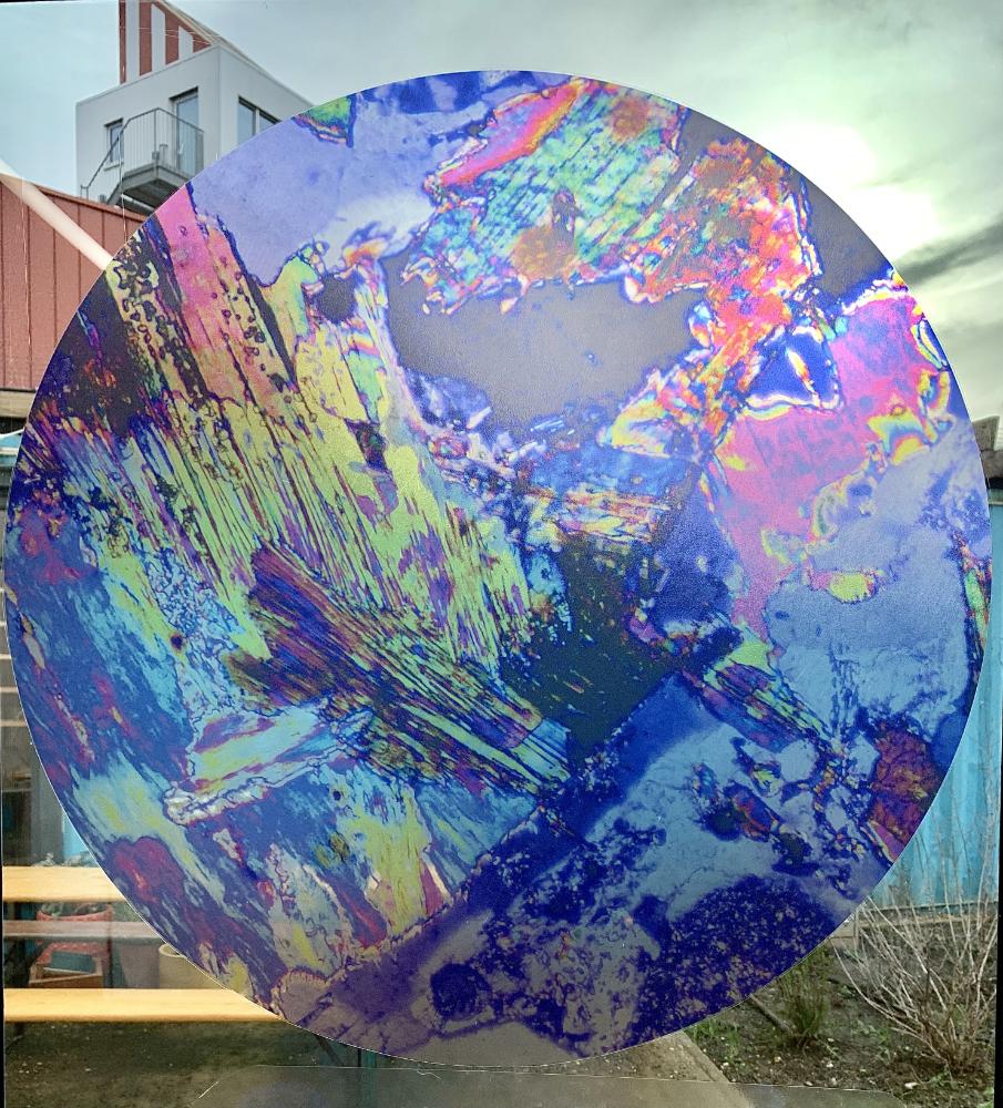 Jamie Foster also photographed various thin sections of rock using Geckoella’s petrographic microscopes. These intricate images were developed by Alison Jacobs into vinyl installations for the workshop’s smaller entrance window, forming a luminous, stained-glass-like composition reminiscent of planets in a distant galaxy. Illuminated from within after dark, the effect is particularly spectacular and reveals at architectural scale what is usually only seen under a microscope. Thin sections are an essential tool in Geckoella’s building stone investigations, and seeing them enlarged in this way offers a rare and powerful perspective..