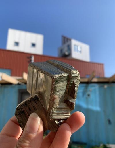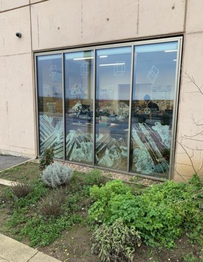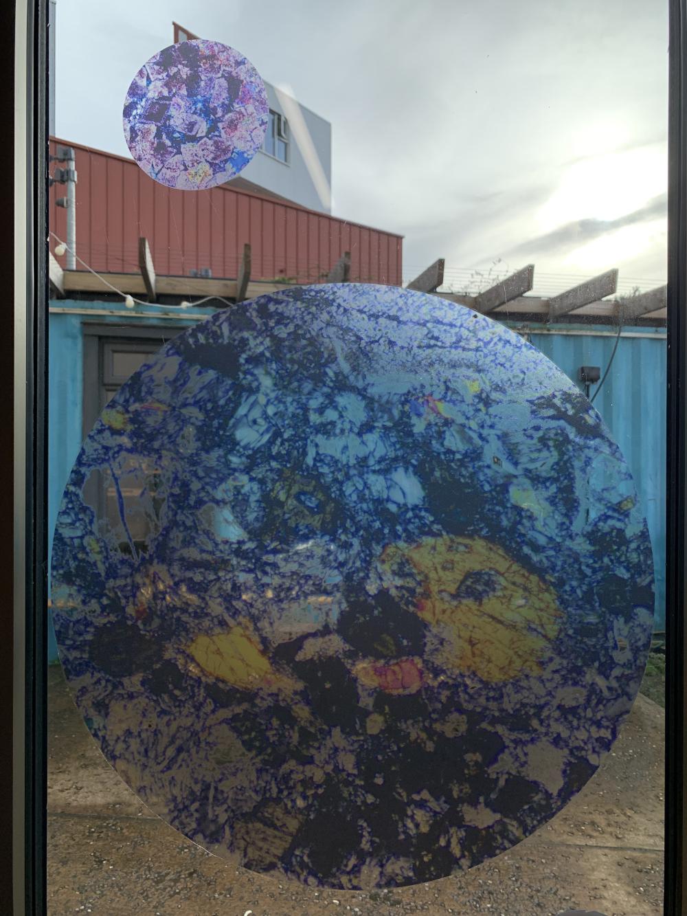 As part of the exhibition, Geckoella’s workshop windows have been transformed. The larger window features The Seven Primitive Crystal Systems, floating above an image of a Gabbro thin section. Conceived by one of Geckoella’s geologists, Jamie Foster, the design was brought to life in chalk paint by the company’s ecologists Mireya García Tamayo and Allison Clarke, under the guidance of artist Alison Jacobs.